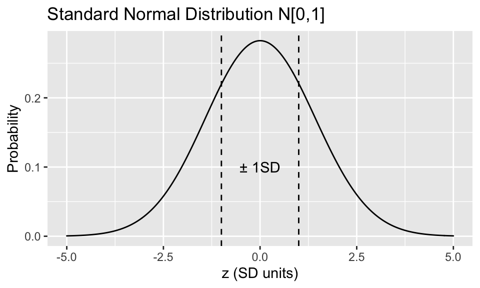 A normally distributed \(x\) can be standardized via \(z = \frac{x-\mu}{\sigma}\). This is the standard normal or Z distribution with with mean = 0, SD = 1 i.e. x is transformed into a Z-score measured in SD units