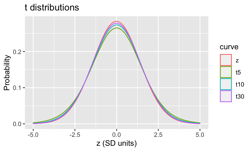 Clearly, the distribution of continuous data are important so you can summarize them properly; Gaussian distributions are also important in statistical inference. Through the magic of the central limit theorem and maximum likelihood estimation procedures (more later), most statistical models return parameter estimates that may be assumed to be normally distributed, with some \(\mu\) and \(\sigma\). Unfortunately, we rarely know the true population parameters, and we are obliged to replace them with their sample estimates when making inferences e.g. calculating p-values or confidence intervals. As a result, the Z distribution no longer applies. Instead, the results are now decribed by the Student’s t-distribution with n degrees of freedom. Although the math gets complicated, the \(t_n\)-distributions also have probability density functions for calculating probabilities, and you can find analogous tables in the back of any statistics text.