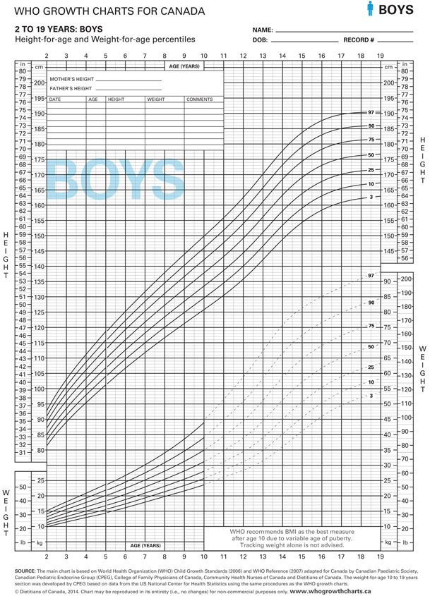 These examples also make the point that percentiles are a useful way to summarize large amounts of data, whether or not the data are normally distributed. As you know, Celia and I spent close to two years of our lives on the re-analysis of the original WHO data to create the new Public Health Agency of Canada’s 2014 WHO Growth Charts for Canada. I am therefore confident that you will plot every child you see on a growth chart like this one, which is the usual boys height and weight chart. For any age between 2-19 years, you are given the percentile distribution of heights and weights, from the \(3^{rd}\) to the \(97^{th}\) percentiles. Height below the \(3^{rd}\) percentile is by definition stunted. Weight that crosses two percentile curves is defined as failure to thrive. So percentile curves and z-scores are important clinical tools in pediatrics.