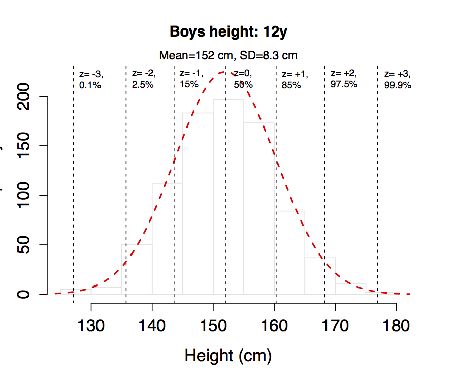 For example, here are height measurements on the 861 boys aged 12y used to create the WHO growth charts for Canada, with a mean of 152 cm and an SD of 8.3 cm. If you compare the empiric distribution (histogram) with the theoretical normal distribution for this mean and SD (dashed red line), the fit is excellent, which means we can use the mean and SD to describe your sample. Then for any height value, we can calculate the corresponding z-score or percentile from the normal distribution, where the \(x^{th}\) percentile is generally defined as the value that exceeds x% of the data. For example, values to the left of z = -2 will occur with a probability of 2.5%. From this, you should also appreciate that the difference between z = -2 (2.5%) and z = +2 (97.5%) represents 95% of the population. The following z-scores and corresponding percentiles should already be familiar to you from clinical growth charts.
