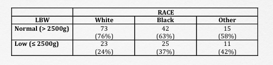 lowidentifies newborns with low birth weight (\(\leq\) 2500g), and the race variable identifies parental race as ‘white’, ‘black’, or ‘other’. - To facilitate interpretation, it is helpful to include column (or row) percentages