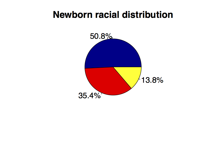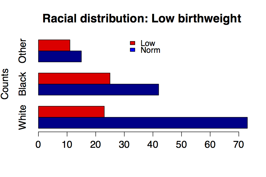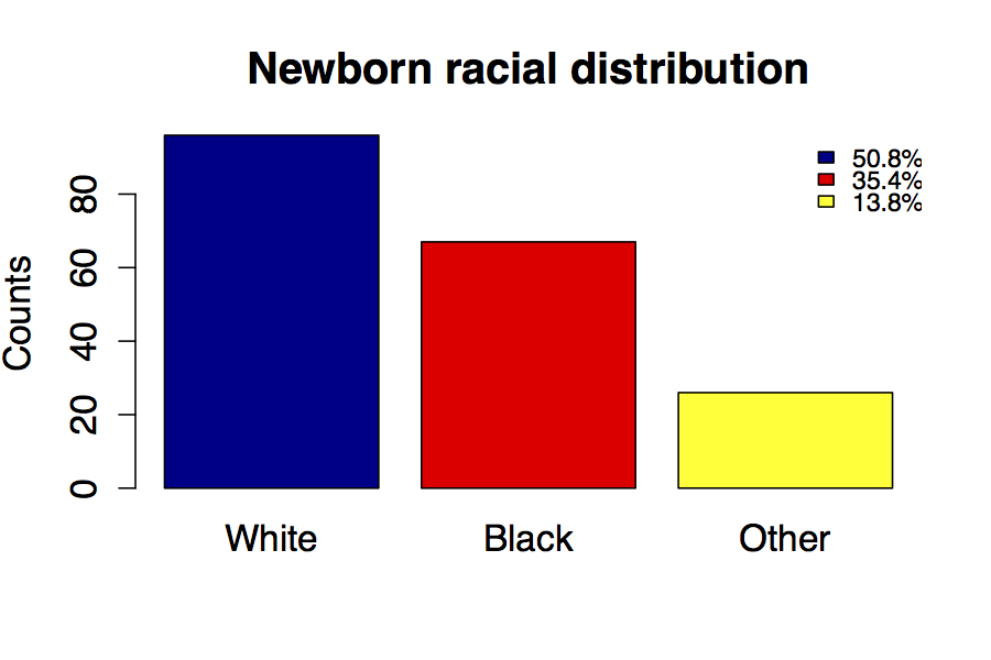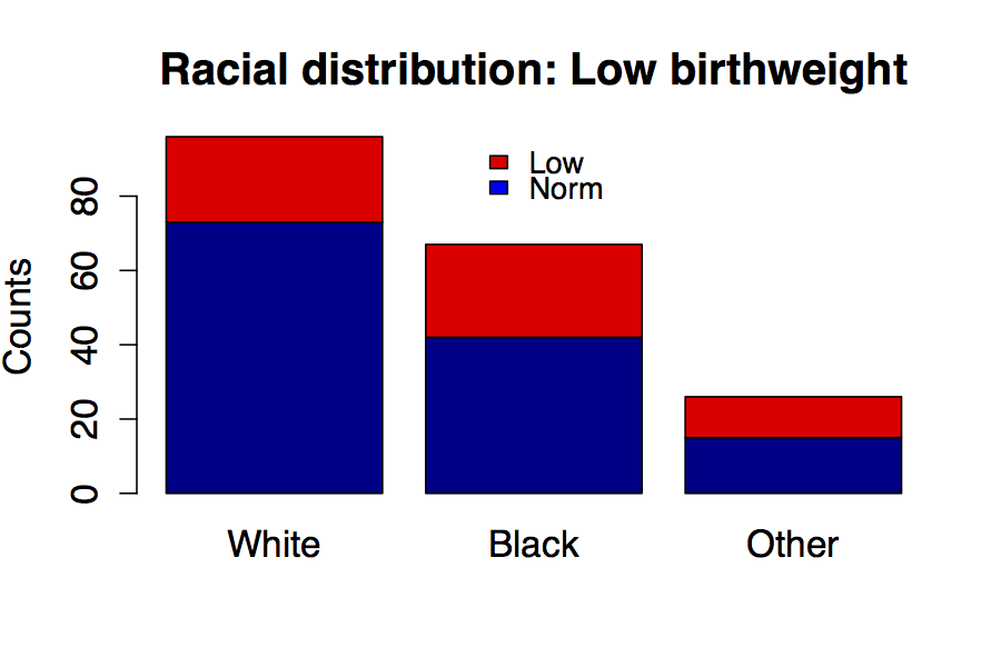 Stacked barcharts communicate even more information than the pie or simple bar chart. Here, we see the racial composition of the newborn population as well as the numbers and proportions with low birth weight in red.
