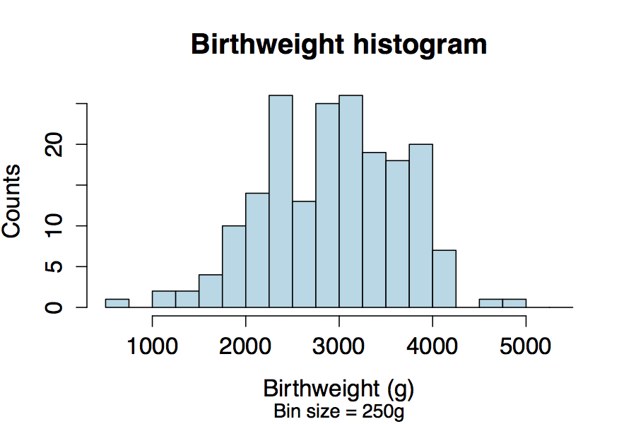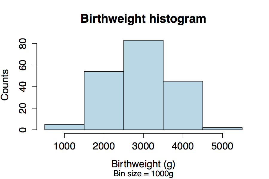 If we have too few bins, we can over-smooth the data and lose important information about its variability. Here the bin size is 1000g.