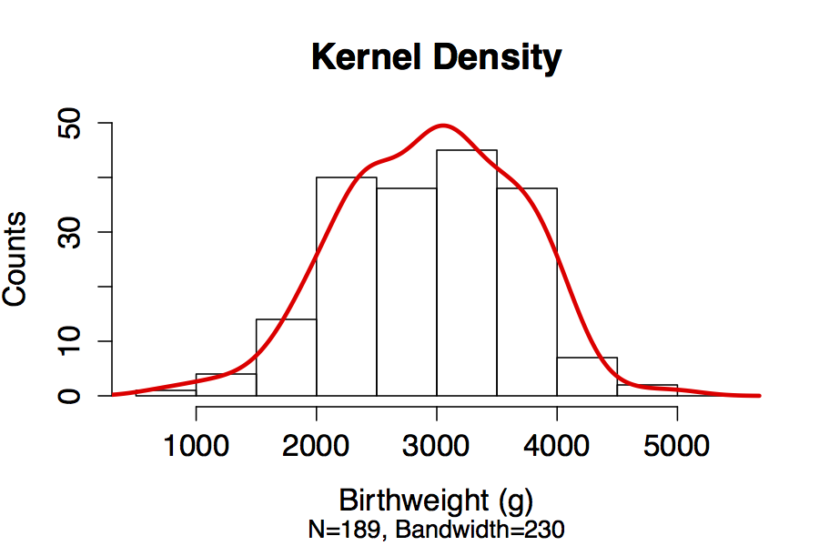 For continuous data, we might wish to examine the continuous distribution by smoothing the histogram using what we call kernel density estimation. Here, we superimpose the default kernel density over the default histogram. The default algorithm chose a bandwidth of 230, which determines how smooth the resulting density will be.