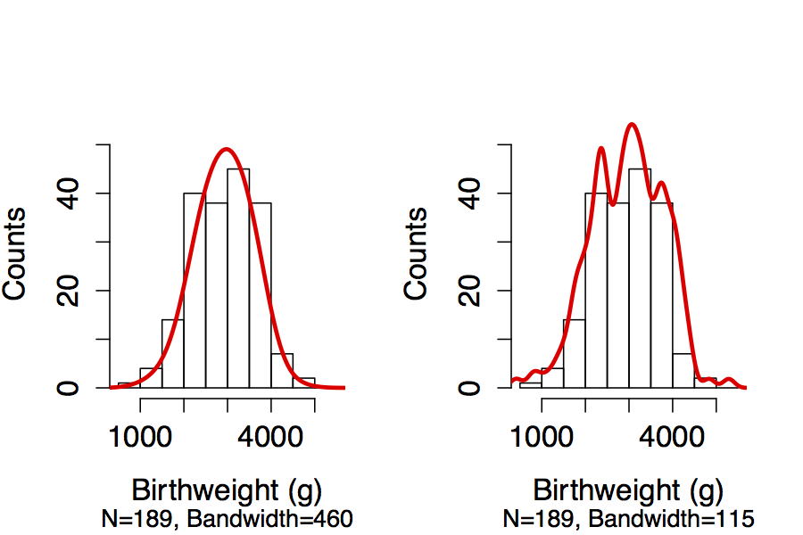 By increasing the bandwidth, we sacrifice some detail to buy a smoother estimate (left). On the right, we’ve opted for less smoothing and may be capturing random variation in the distribution.