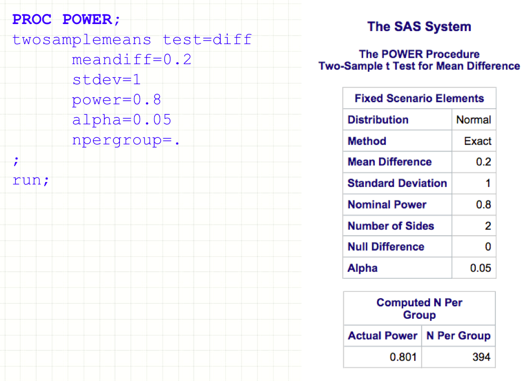 Of course, the same calculation can be done in SAS (PROC POWER):
