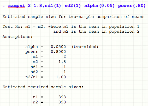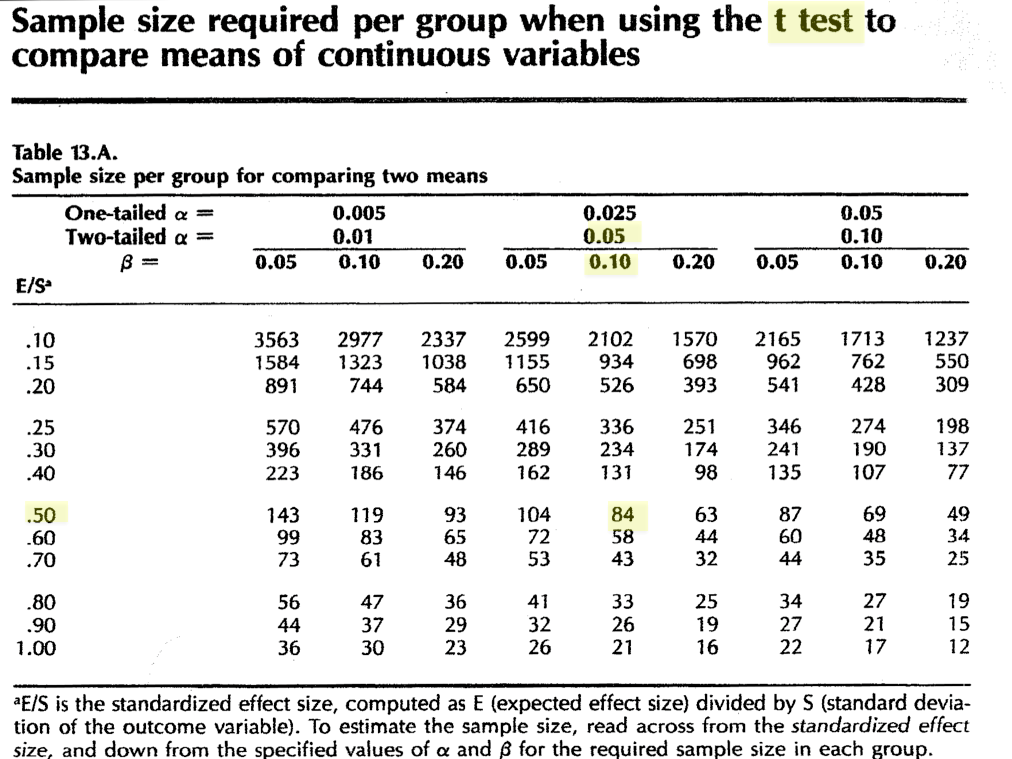 - a standardized effect size E/SD = 0.2 simplifies use of published sample size tables, such as those found at the back of Hulley and Cummings, Designing Clinical Research.