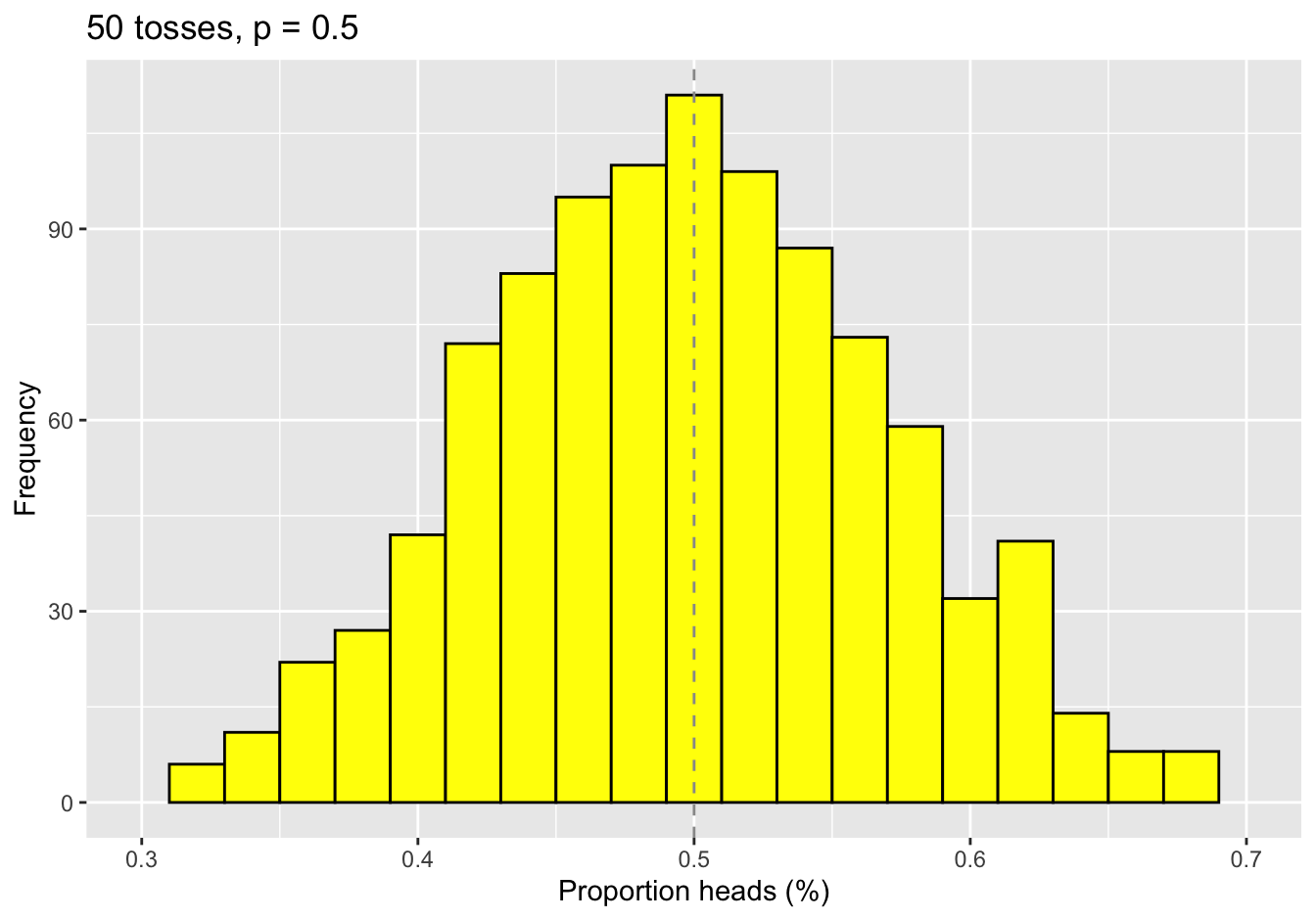 To persuade you, we flipped a coin 50 times and recorded the numbers of heads. We then repeated this trial 1000 more times and plotted the frequency distribution of the sample means: