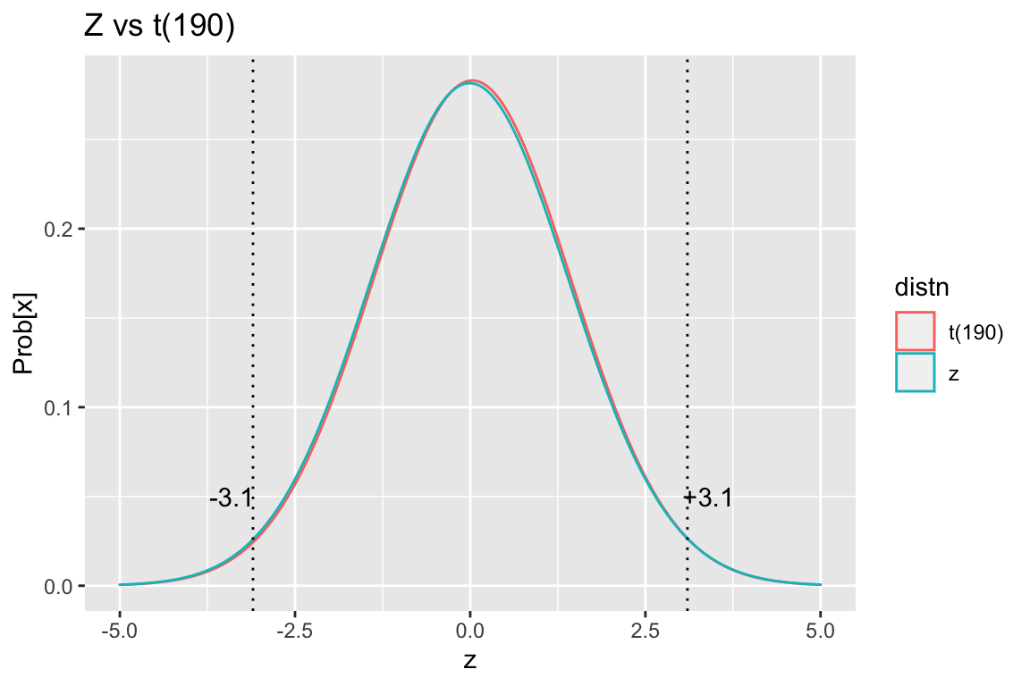 Everyone should do one t-test by hand at least once, but we can now let the computer repeat this two-sided, two-sample t-test with unequal variances (Welch test). Since the t-distribution with 190 degrees of freedom is almost identical to the Z-distribution in the above figure, we expect a very similar result.