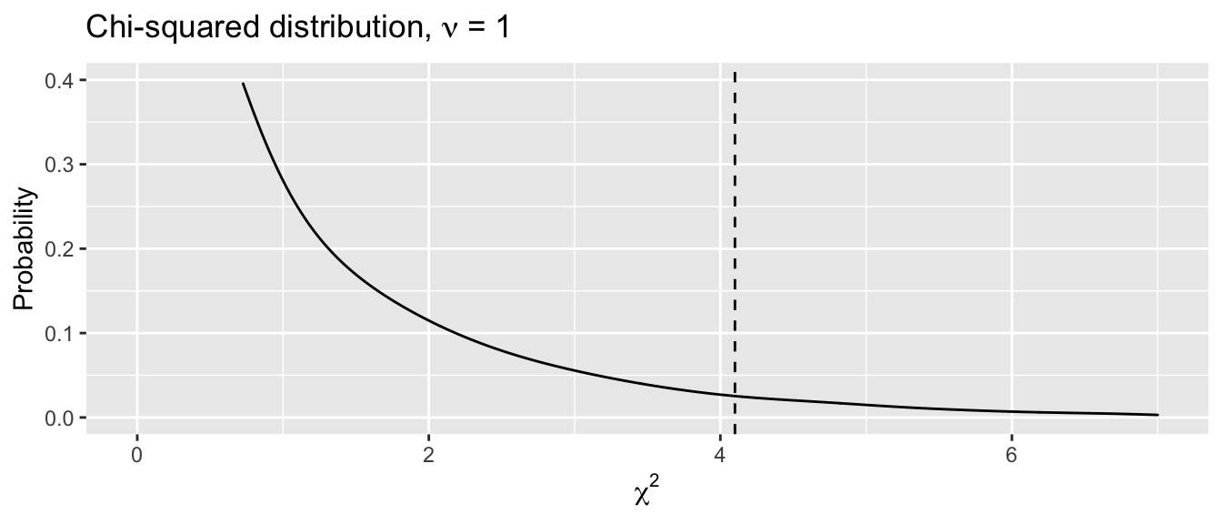 Given a contingency table with R = number of rows and C = number of columns, the degrees of freedom \(\nu\) = (R-1)(C-1) = 1. So we want to know how probable a value of 4.1 is to arise by chance from a chi-squared distribution with 1 degree of freedom, which is the area under the curve to the right of the dashed line below. Unlike, the normal distribution, all tests are one-sided, since the test statistic \(\chi^2 \geq 0\)):
