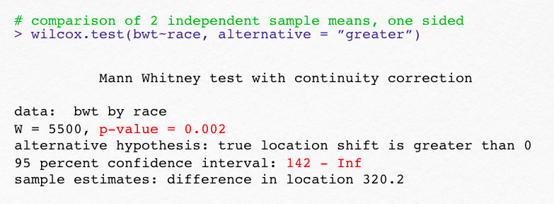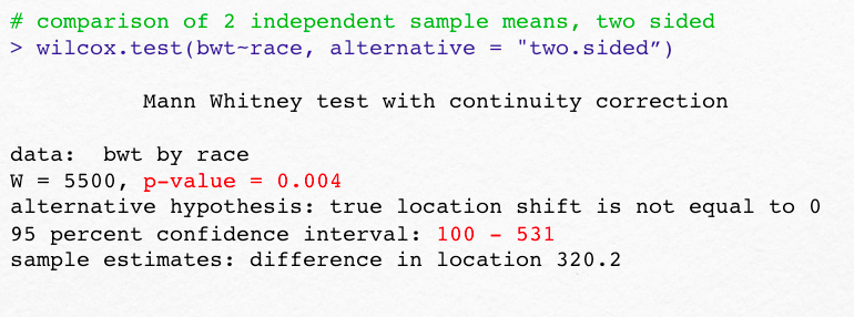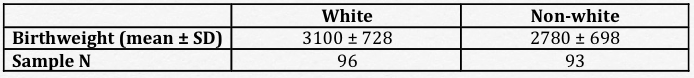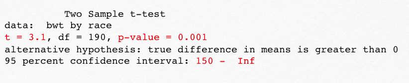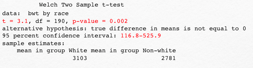 Recall that such comparisons are based on what we call analysis of variance or ANOVA. To illustrate the method, let’s continue to compare mean birthweight in just 2 race categories (white vs non-white).