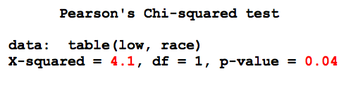 We could look this probability up in a chi-squared table at the back of the book or simply ask our statistical software to calculate it for us using the appropriate function chisq.test(). The result indicates that there is a \(<\) 5% chance of a larger value of \(\chi^2\) arising randomly from sampling variation, and we reject the null hypothesis, concluding that there is a statistically significant association between low birth weight and race: