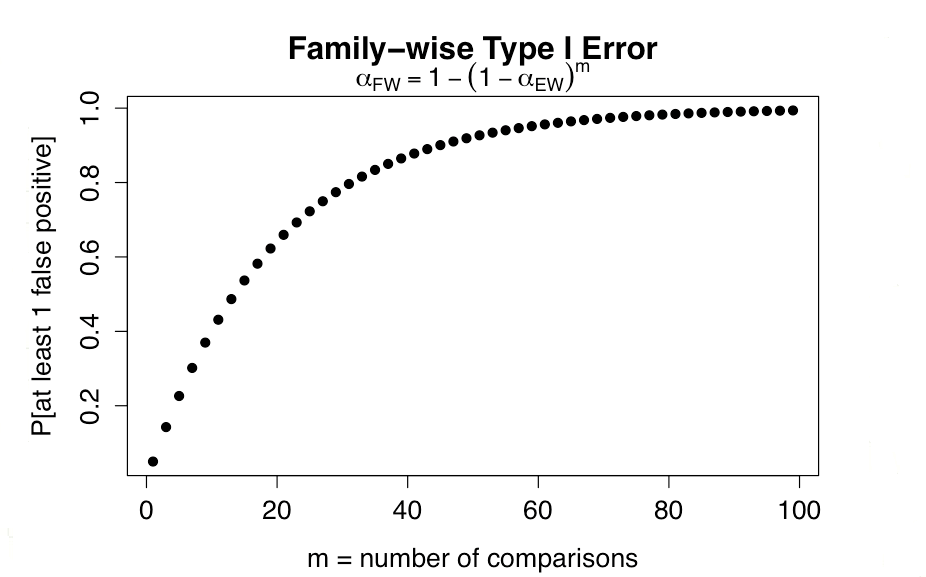 Not surprisingly, as few as 13 comparisons (p \(<\) 0.05) will have a type I error rate of 50%!