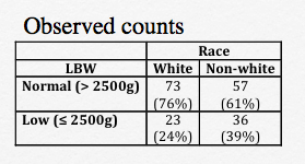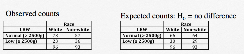 Apparently, non-white race doubles the odds of LBW, but we want to know if this could simply be the result of random chance? To answer this question, we will compare the observed counts to those expected under the null hypothesis (\(H_0\)) that there is no association between birth weight and race.