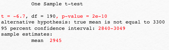 These are both examples of what we call independent, two-sample t-tests because we’re comparing two independent groups. In a one-sample test, on the other hand, we compare the mean in a single group to some hypothetical value, which we know exactly (SE=0). For example, we could test the specific hypothesis that the mean birthweight in Springfield MA is equal to 3300g, which is the global average for healthy term newborns according to the WHO. We would therefore specify a one-sample test against a known mean, in this case 3300g. As you can see, this changes the t-statistic and the p-value. The point is that you have to know which test you’re asking for.