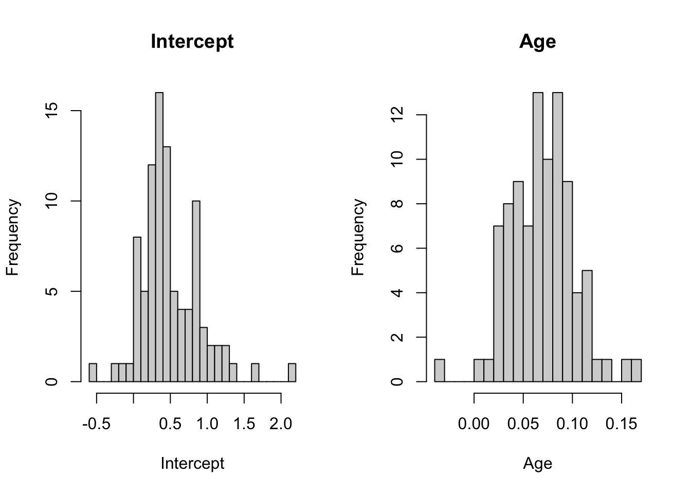 The important take away from these plots is that both intercept and slope estimates show considerable variation, suggesting that both a random-intercept and a random-slope may be needed to fit the data.