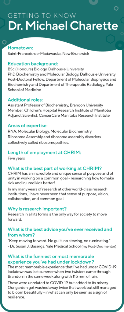 CHRIM scientist, Dr. Michael Charette, an Assistant Professor at Brandon University, joined CHRIM five years ago from a small town in New Brunswick to further his research in rare diseases, specifically looking at the assembly of ribosomes. Ribosomes are more easily described as the tiny machines in all our cells that read our genetic information (through mRNA) and translate it into proteins. These proteins give our cells their shape and allow our bodies to move (think about the proteins that make up our muscles!) and support basic body functions such as digestion.